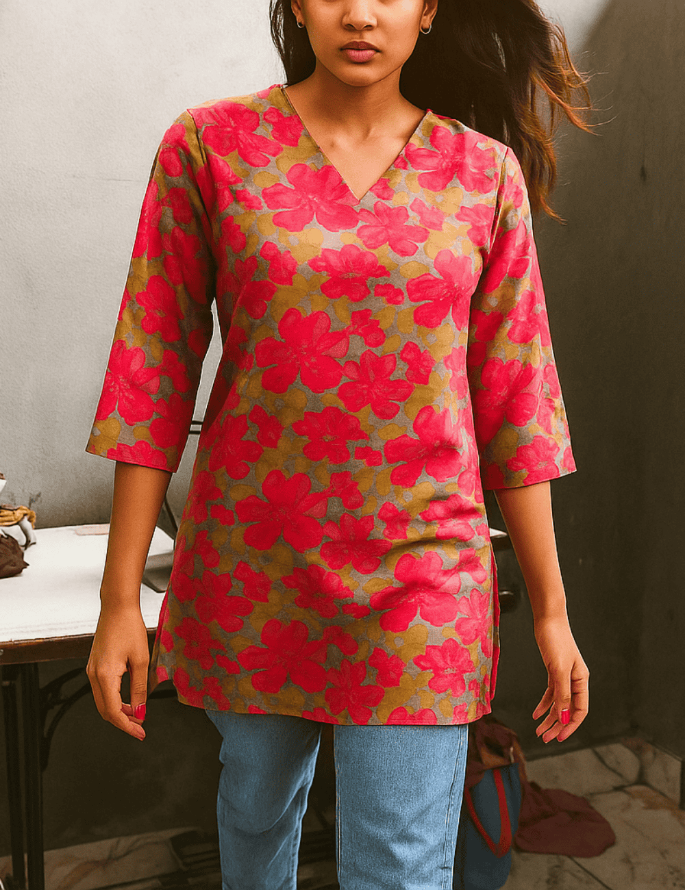 Vibrant rose-pink floral kurti with a flattering V-neck and 3/4 sleeves. Relaxed, straight fit with side slits for easy movement—perfect for brunches, workdays, and festive-lite outings.