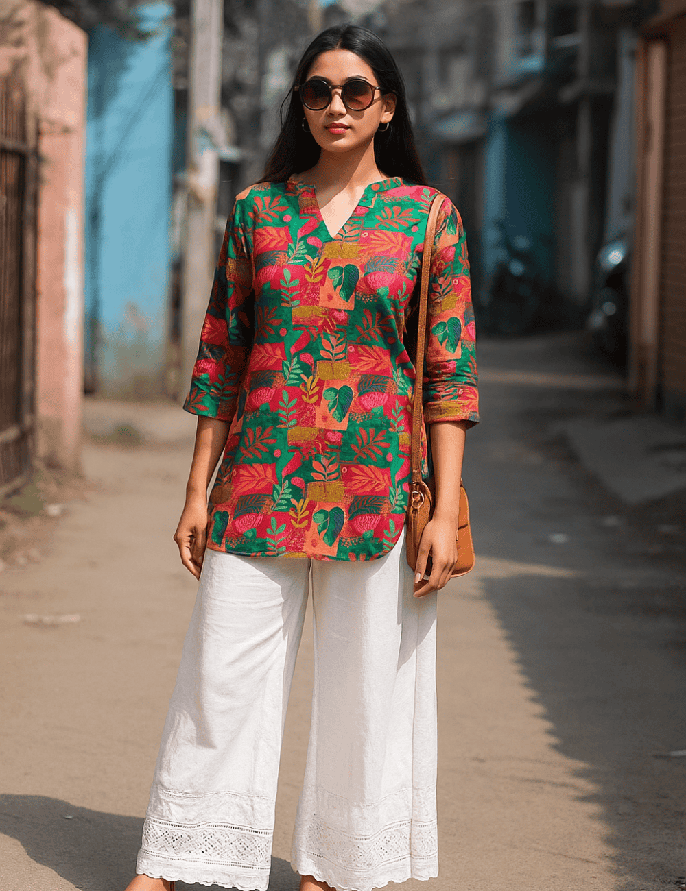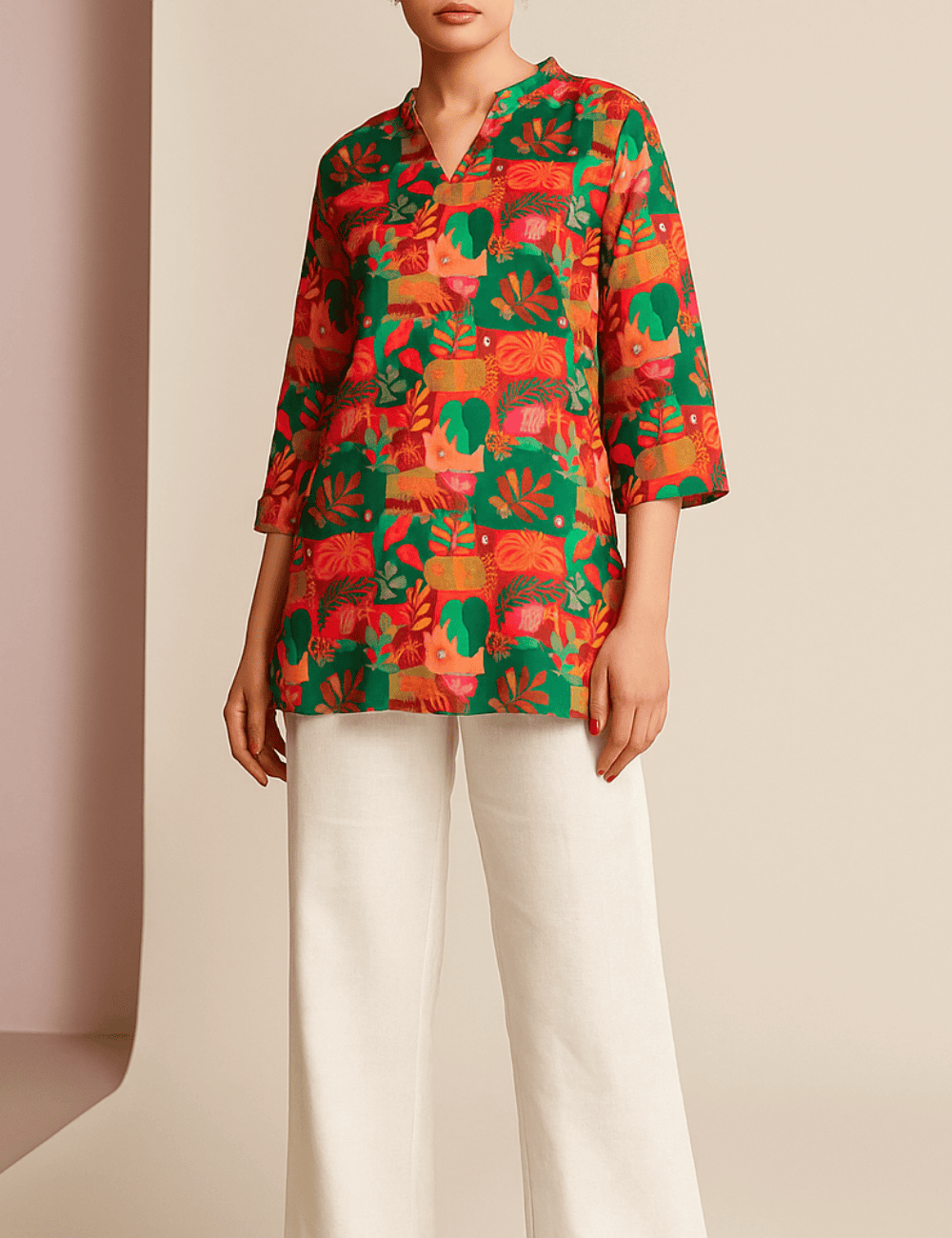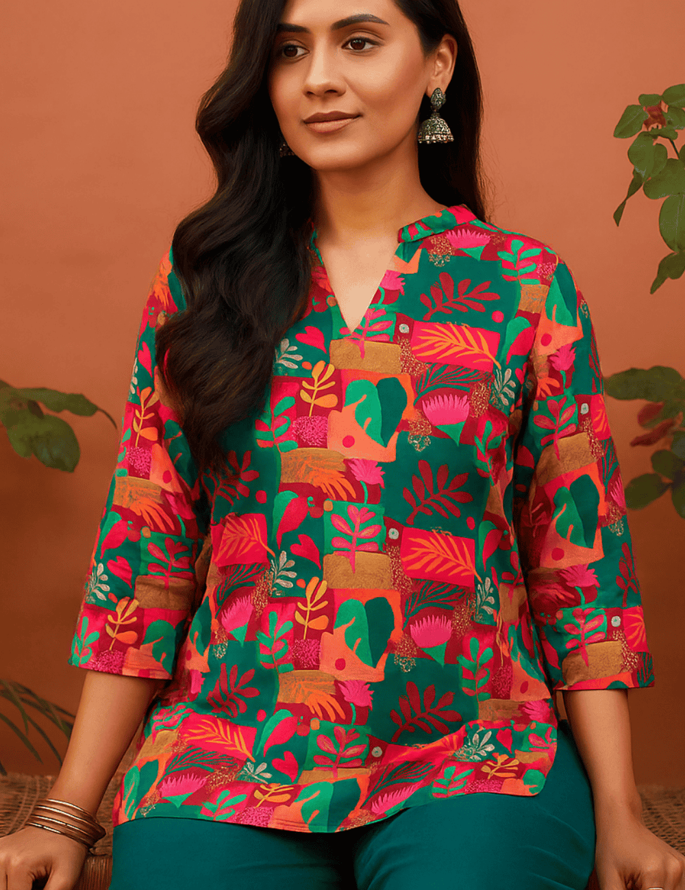 Step into bold, city-ready color with the Urban Jungle Printed Kurti. A vibrant palette of greens, corals, and gold-tones meets tropical leaf and floral motifs for an artful, contemporary look. The refined notch neckline flatters the collarbone, while 3/4 sleeves keep the silhouette crisp and comfortable. Cut in a relaxed, straight fit with side slits, it drapes effortlessly for all-day ease—whether navigating meetings, market strolls, or evening catch-ups.
